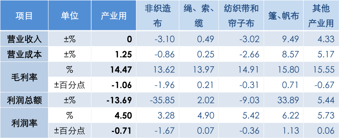 經(jīng)濟(jì)效益方面,1 - 8月,工業(yè)紡織行業(yè)規(guī)模以上企業(yè)營(yíng)業(yè)收入已回升至2021年同期水平,利潤(rùn)總額同比下降13.7%,利潤(rùn)率為4.5%,同比下降0.7個(gè)百分點(diǎn),1 - 8月,非織造布規(guī)模以上企業(yè)的營(yíng)業(yè)收入和利潤(rùn)總額分別同比下降3.1%和35.9%,利潤(rùn)率為3.3%,同比下降1.7個(gè)百分點(diǎn); 繩、索、纜規(guī)模以上企業(yè)的營(yíng)業(yè)收入和利潤(rùn)總額分別同比增長(zhǎng)0.5%和2.0%,利潤(rùn)率4.9%,提高0.1個(gè)百分點(diǎn)。規(guī)模以上紡織帶簾面料企業(yè)營(yíng)業(yè)收入和利潤(rùn)總額分別下降3.0%和9.0%,利潤(rùn)率為5.4%,同比下降0.4個(gè)百分點(diǎn); 篷、帆布規(guī)模以上企業(yè)的營(yíng)業(yè)收入和利潤(rùn)總額分別同比增長(zhǎng)9.5%和33.9%,6.2%的利潤(rùn)率為行業(yè)最高水平;過(guò)濾、土工用紡織品所在的 其他產(chǎn)業(yè)用紡織品規(guī)模以上企業(yè)的營(yíng)業(yè)收入和利潤(rùn)總額分別同比增長(zhǎng)4.3%和5.4%,利潤(rùn)率為5.7%,同比增長(zhǎng)0.1個(gè)百分點(diǎn)。