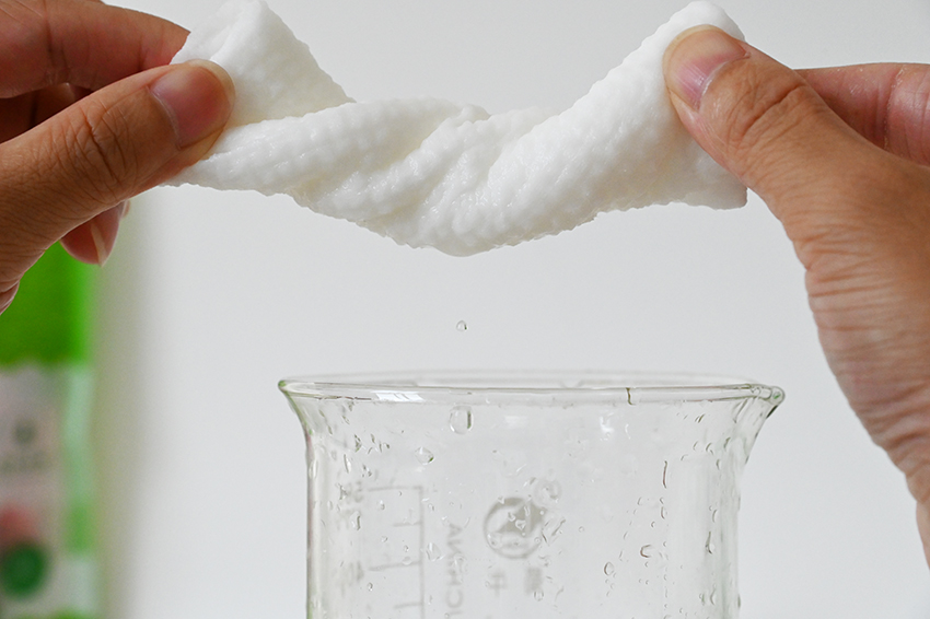 2、將壓縮毛巾放入清水中浸泡一會兒,等壓縮毛巾充分吸收水分,嫌麻煩的朋友也可以直接在水龍頭上進行水分吸收,最后我們擠掉多余的水分再順著紋理將毛巾完全打開就可以正常使用了;