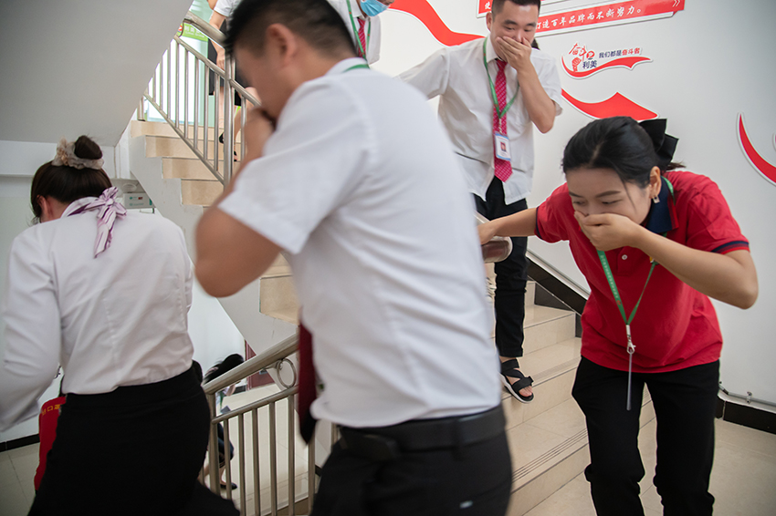 在接下來的實地疏散演練中,員工也是積極參與,隨著警報的鳴響,參加演練人員各就各位。各部門員工用口罩捂著口鼻,貓腰有序地按指定路線“逃生”,消防演練小組負責人帶著人員有序地疏散到指定安全區(qū)域。